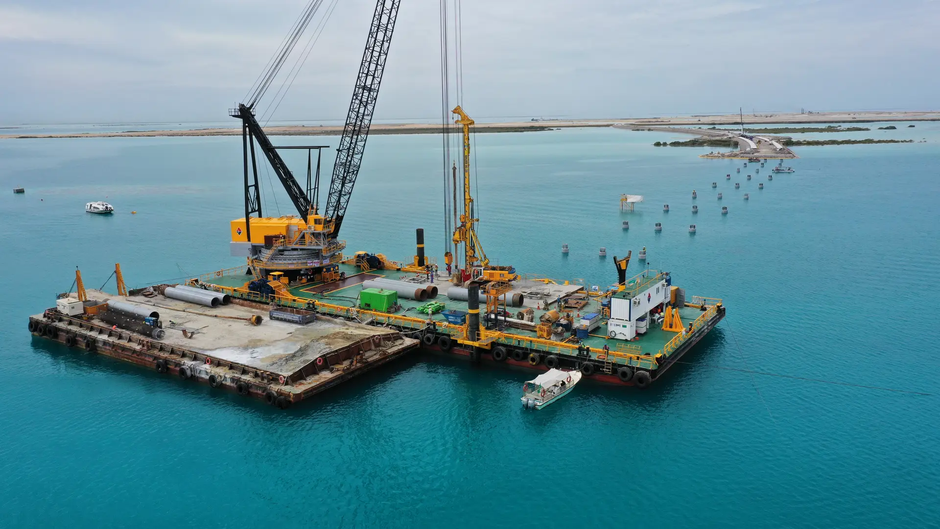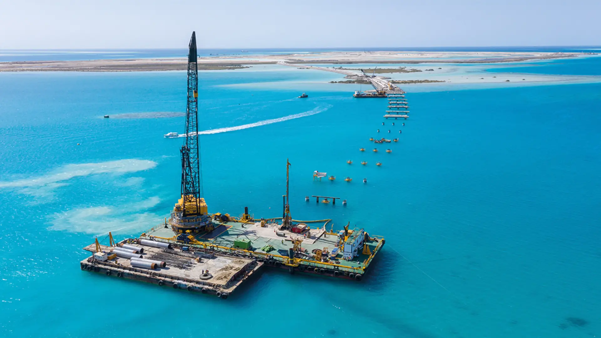 Approximately 500 km north of the city of Jeddah in Saudi Arabia, a new recreation area is currently being established as part of the “Red Sea Islands” Project that will combine nature, culture and adventure. By 2030, a total of 28,000 m² of beach, desert, mountains and volcanic areas on 22 islands will be transformed into an environmentally-friendly tourism center in Saudi Arabia. The sensational achievement: As part of this megaproject in Saudi Arabia, Bauer installed piles for several bridge structures with diameters of up to 1,500 mm. The specially manufactured floating crane from the client Archirodon and their team assisted the Bauer piling team with the construction of 87 offshore piles. This was no everyday place to work, even for the experts from Bauer.